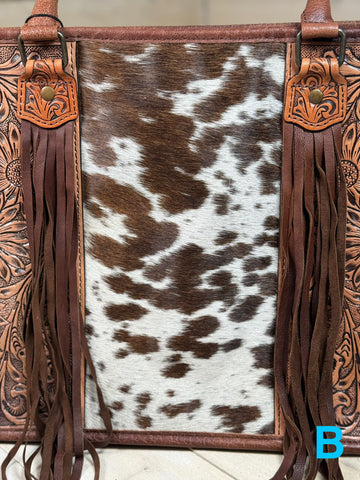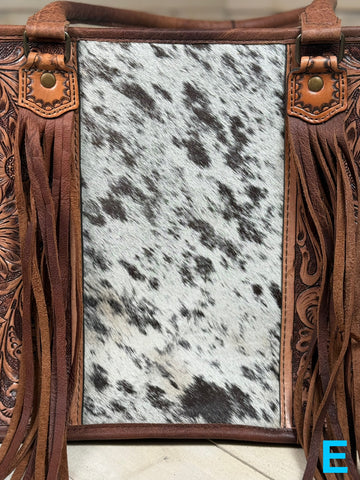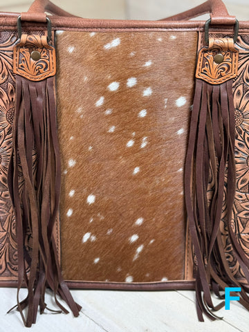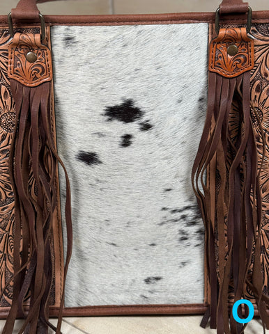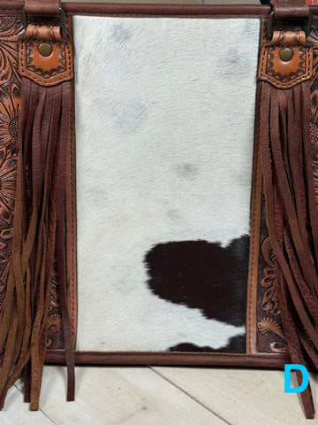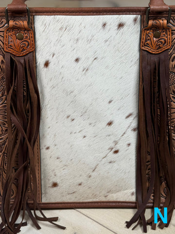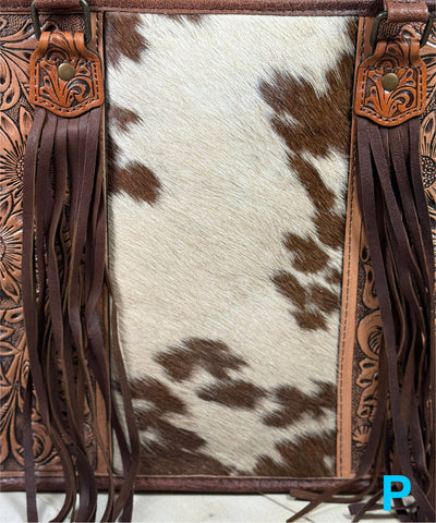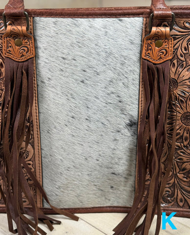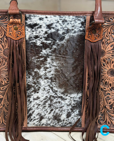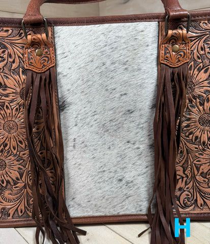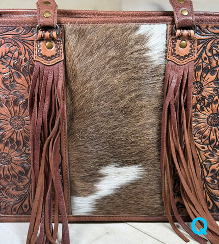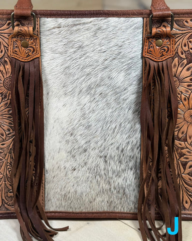 This large western tote is designed for daily adventure—whether you're heading to work, carrying your laptop, or hitting the road for your next rodeo weekend. Crafted from premium tooled leather with sunflower detailing and paired with patterned hair-on cowhide, this bag blends function, style, and Western flair.
