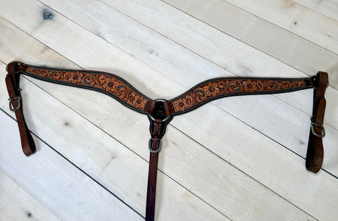 Elevate your tack collection with this beautifully handcrafted Floral Tooled Leather Breast Collar by Bar H Equine. Designed for riders who appreciate artisan detail and premium materials, this set features intricate floral tooling bordered by a hand-painted teal dotted edge for a pop of Western color.