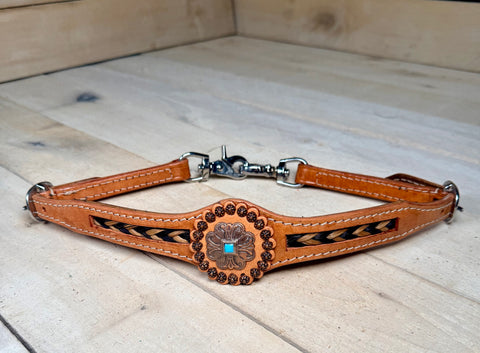 Add authentic Western craftsmanship to your tack collection with this Medium Oil Leather Wither Strap, designed for both performance and standout style. Crafted from rich medium oil leather, this strap features a bold copper concho accented with a turquoise stone and finished with a detailed copper dot border.