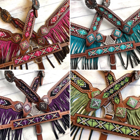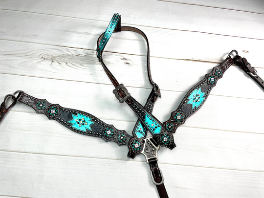 Cowhide on Dark Leather Tack Set with Buckstitch and Crystal Conchos