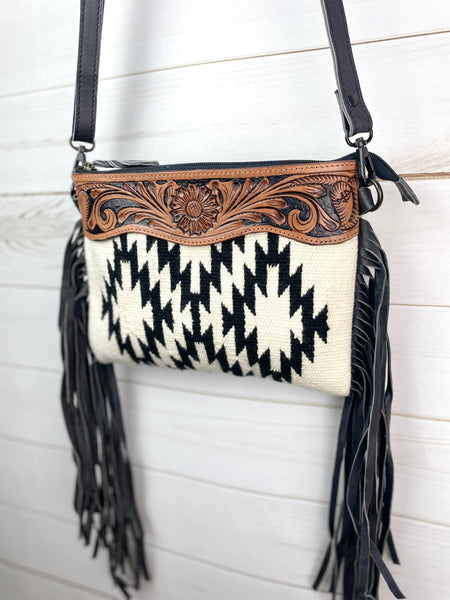 Black Canyon Suede Brocade Leather Tooled Buckstitch Fringe Purse