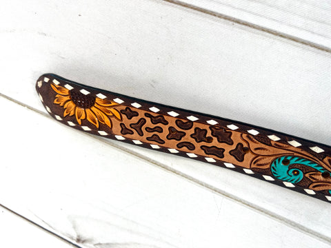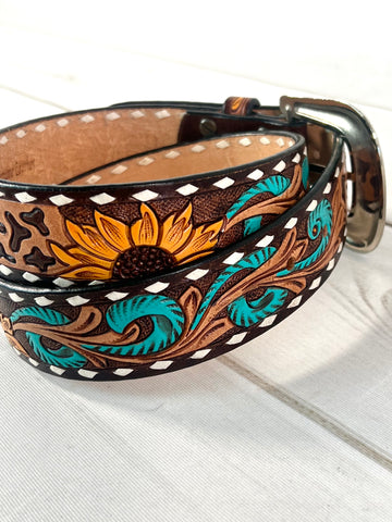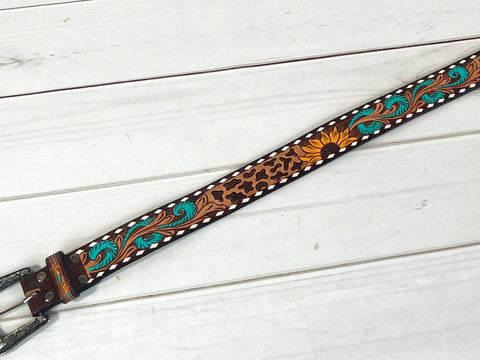 Beautiful tooled leather and hand painted belt with leopard, yellow sunflowers and turquoise scroll. Comes with antique silver buckle and hardware. Buckle is removable.