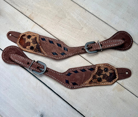 Make a bold and feminine statement in the saddle with these chocolate rough out leather spur straps, designed with a cowgirl’s touch of flair. Featuring black buckstitch trim, hand-tooled daisy accents in top grain leather, and black painted dot detailing, these straps deliver the perfect balance of rugged and refined.