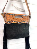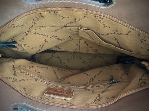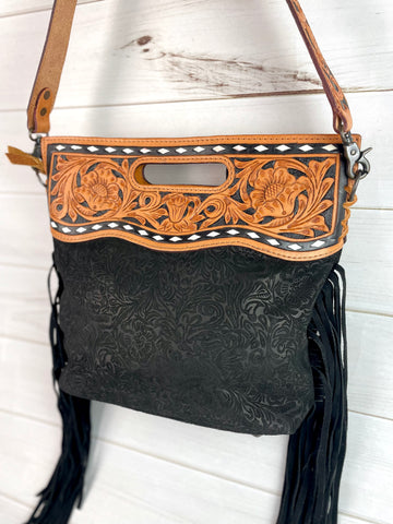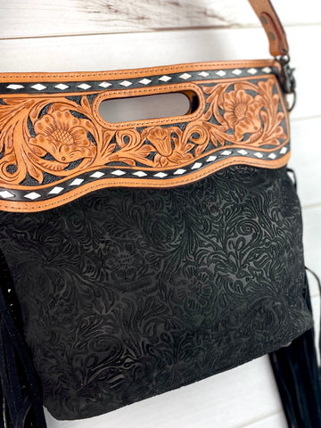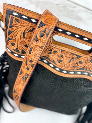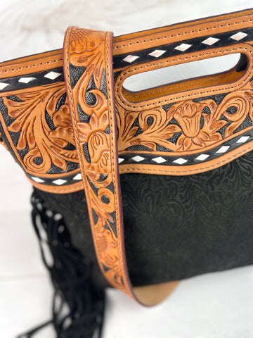Open handle - top zips closed - tooled crossbody strap included (48”)
