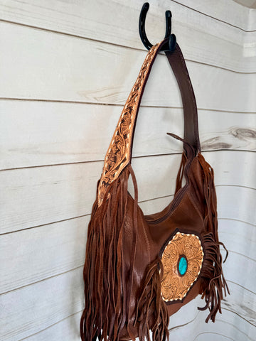 Turquoise Stone Fringe Leather Tooled Hobo Bag