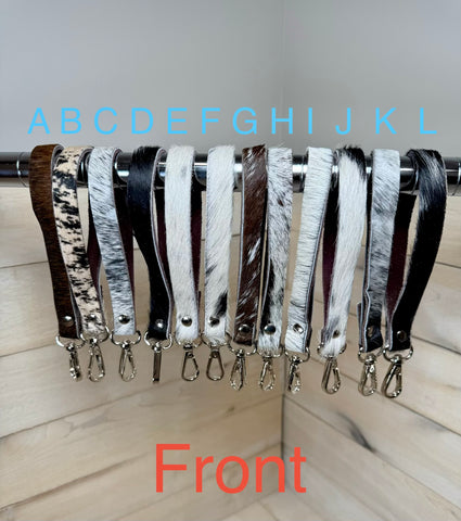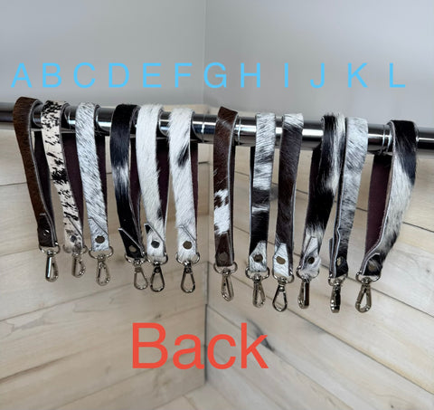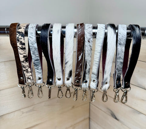 Elevate your everyday essentials with this stylish and versatile Hair on Cowhide Wristlet Loop. Designed for multiple uses, this chic clip can be attached as a keychain, serve as a replacement wristlet for wallets/clutches, or be used for countless other purposes.