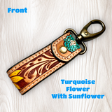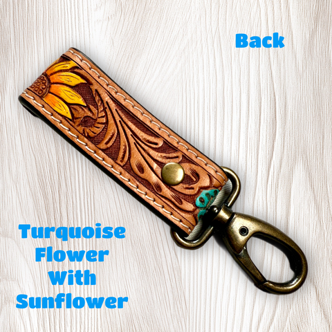 tooled and hand painted leather with rivet closure (not a snap, do not try to pull apart)