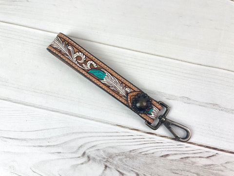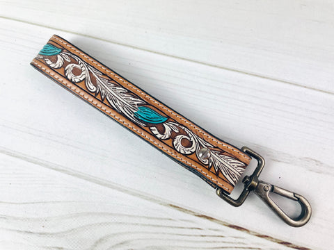 Turquoise & White Feather Tooled Wristlet Leather Keychain
