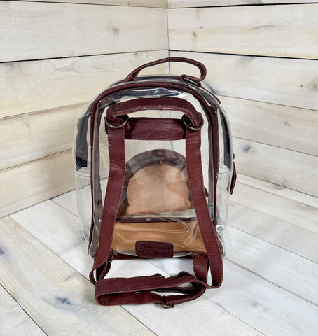 American Darling high quality clear bag backpack. Genuine leather adjustable strap can be single or double strapped. Zipper pocket on front. Super versatile and great for those clear bag policy nights out!