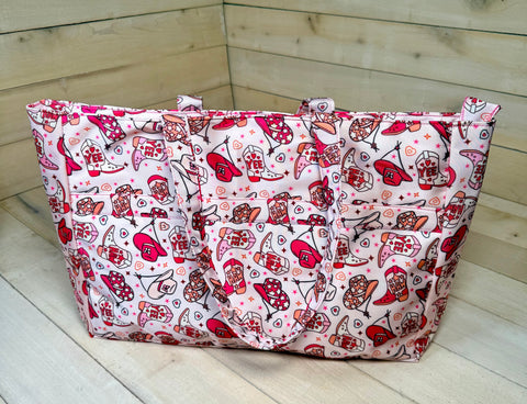 Show off your playful side with a light pink nylon base covered in a hot pink, baby pink, and white YeeHaw Jamboree print—featuring cowboy hats, boots, hearts, and stars! Lightweight and roomy, it's perfect for rodeo weekends or everyday errands.