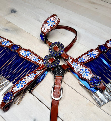 Painted Blue Flower Metallic Fringe Tack Set