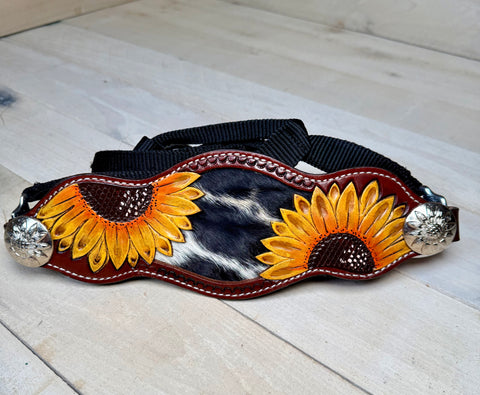 The Painted Sunflower Nylon Bronc Halter combines striking design with dependable performance. Made from durable black nylon, it features a dark oil leather noseband with a genuine cowhide inlay, giving it a rich, textured look that stands out in the barn or the arena.