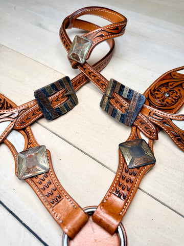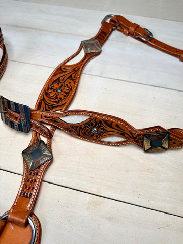 Crafted from premium medium oiled leather, the set features intricate floral tooling that enhances the natural grain of the leather while offering long-lasting durability. The headstall and breastcollar are accented with hair-on cowhide inlays, adding authentic Western texture and one-of-a-kind character to every piece.