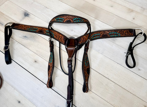 Turquoise Feather Sunflower Tooled Studded Tack Set