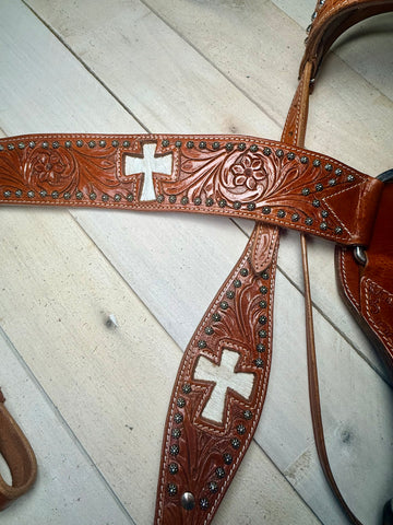 Make a bold statement in the arena or on the trail with this stunning 3-piece tooled leather tack set featuring cut-out cross accents and hair-on cowhide inlay for that classic Western soul with modern flair.