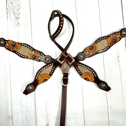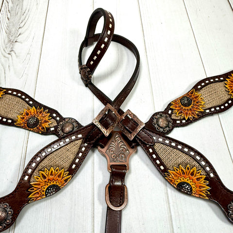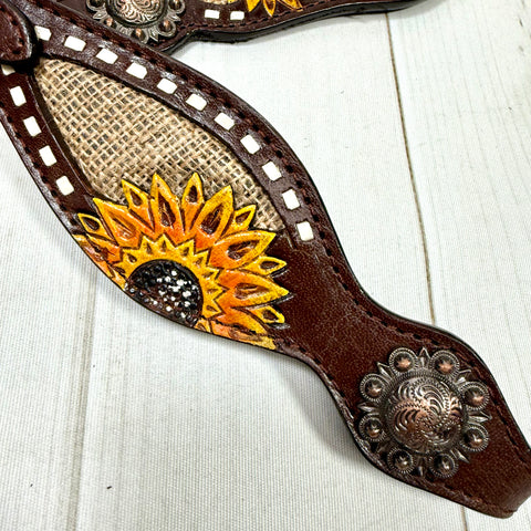 Turn heads in the arena with this stunning tack set featuring a unique blend of rustic charm and bold western flair. Crafted from rich dark leather, this Full Horse Size one ear headstall and breastcollar set is highlighted with a tan burlap inlay and beautifully hand-painted sunflower accents.