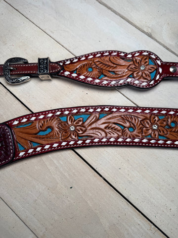 Make a bold statement in the saddle with this burgundy oil one ear bridle and breast collar set, featuring a stunning mix of floral tooling, basket stamping, and teal underlay for the perfect blend of traditional Western style and vibrant color.