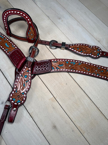 Floral Tooled One Ear Headstall & Breast Collar Set with Teal Underlay