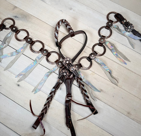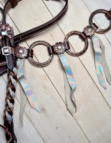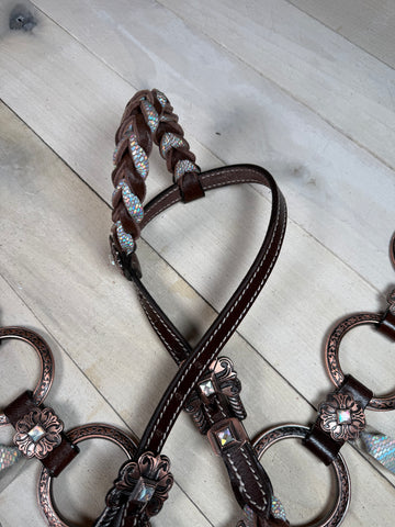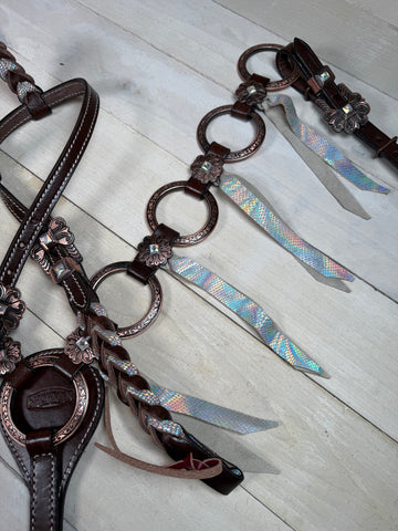 The one ear headstall features a twisted braid design with a frosted silver shimmer overlay that sparkles in the light, while the breastcollar is enhanced with bold engraved copper rings for a timeless Western finish. Both pieces are adorned with floral copper conchos featuring rhinestone centers, offering just the right touch of glam.