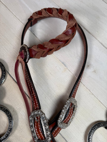 Crafted from medium oiled leather, this one ear headstall and breastcollar set delivers classic performance with handcrafted details. The headstall features a twisted braid design on the ear and cheeks, adding a textured touch that elevates its Western appeal.