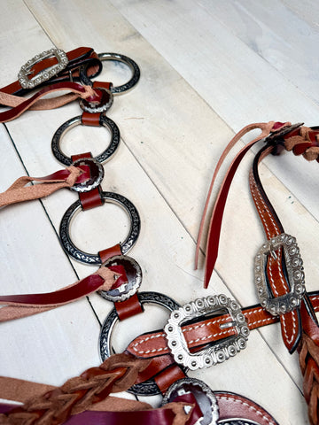 The breastcollar is accented with large engraved silver rings, complemented by antiqued slotted conchos and leather tie accents for a bold and authentic finish. Built for adjustability, the set includes: