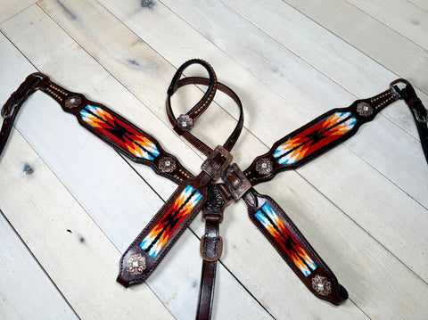 Sunset Red, Orange Blue Woven Copper Concho Tack Set