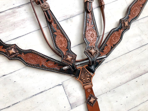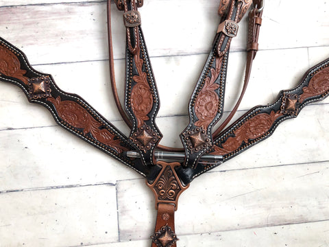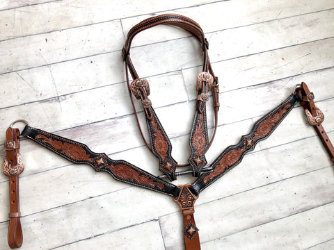 Two Tone Leather Tooled Copper Concho with medium and black leather tack set
