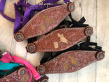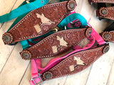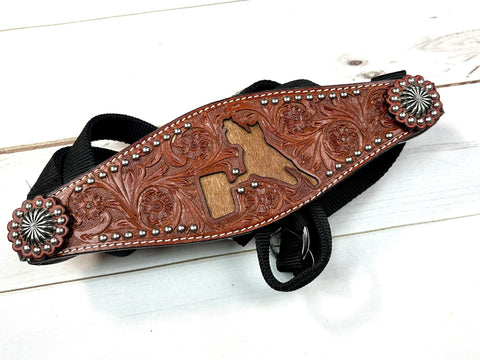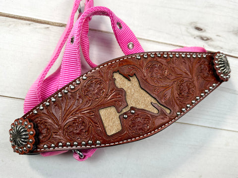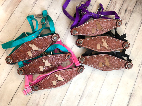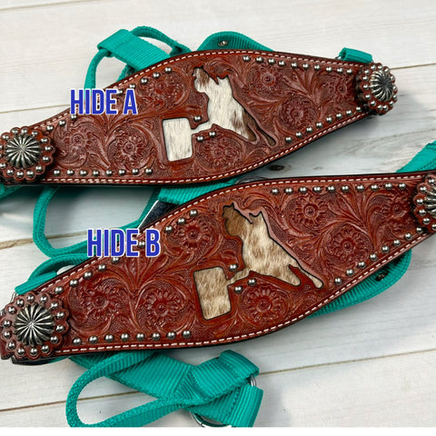 Leather tooled bronc halter with barrel racer cutout that has cowhide inset. Select from 4 different color nylon halters. Cowhide options vary. See photos for options and select from drop down menu.