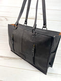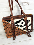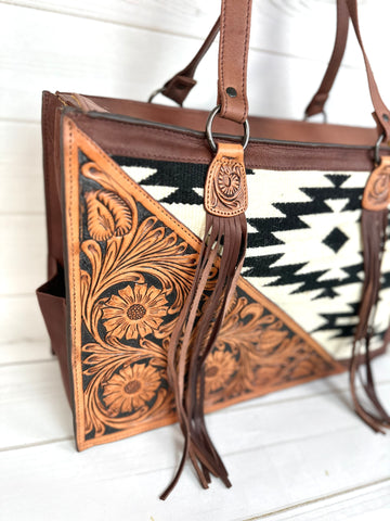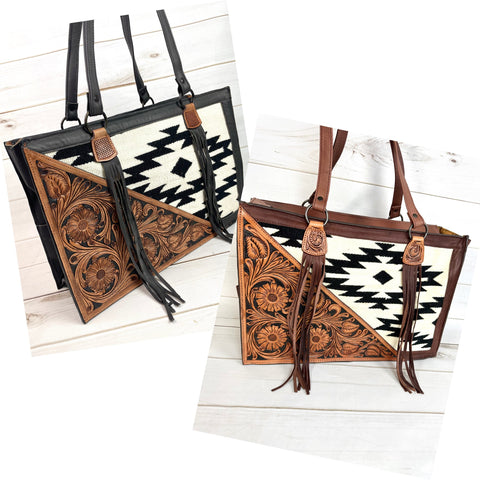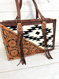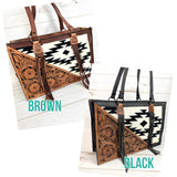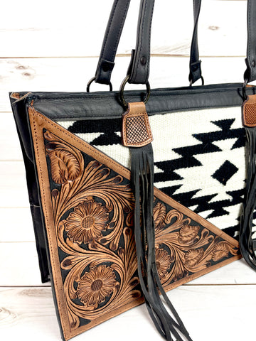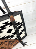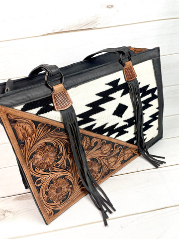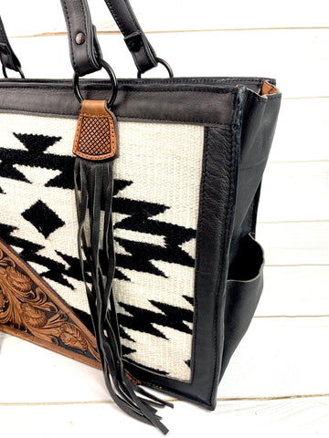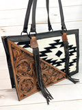 Black and Cream Wool with Tooled Leather Swatch Large Tote Bag