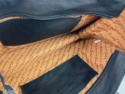 zipper closure at top and zipper and open pocket inside. Concealed carry zipper pockets in leather back. Leather pockets on each side.