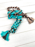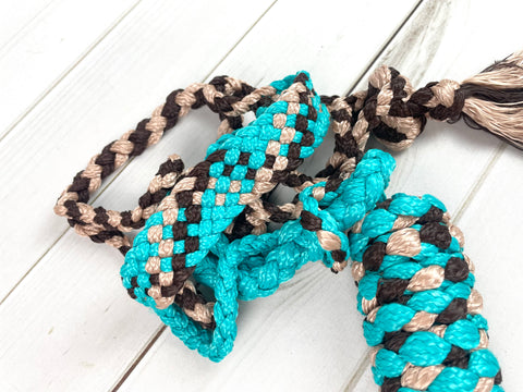 Woven nylon mule tape halter with a removable 8' lead. Has tassel ends at the tie point and tassels on the removable lead. Halter is lightweight.