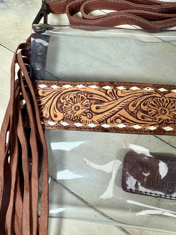 American Darling high quality clear bag crossbody envelope bag. Stadium compliant. Genuine leather adjustable/removable strap. Adorable fringe. Super versatile and great for those clear bag policy nights out!