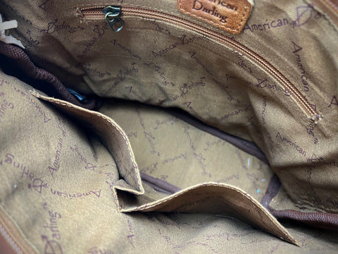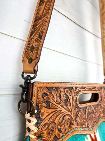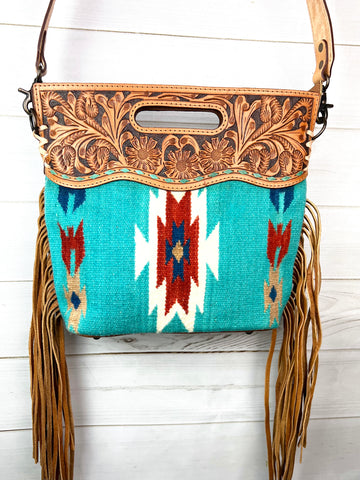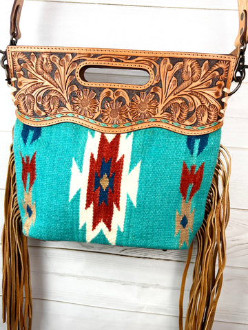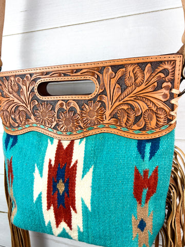 Detailed tooled leather, teal buckstitch with cut out handle over turquoise pattern wool with leather fringe