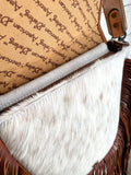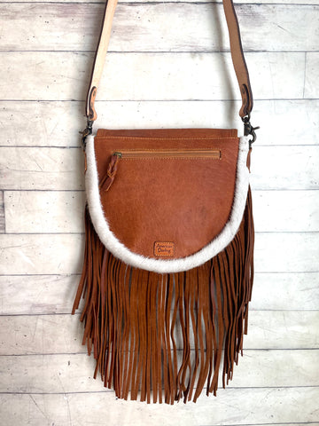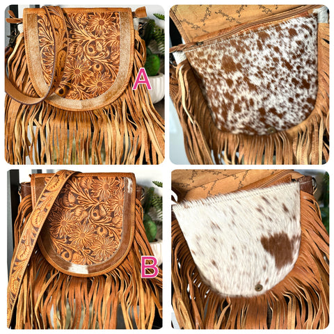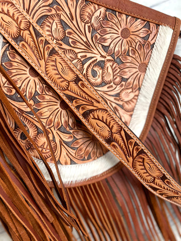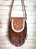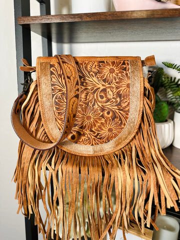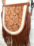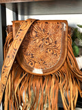 Tan Floral Tooled Leather Saddle Bag Style Fringe Handbag