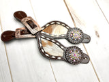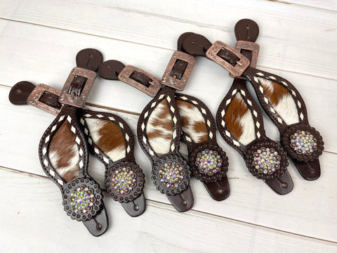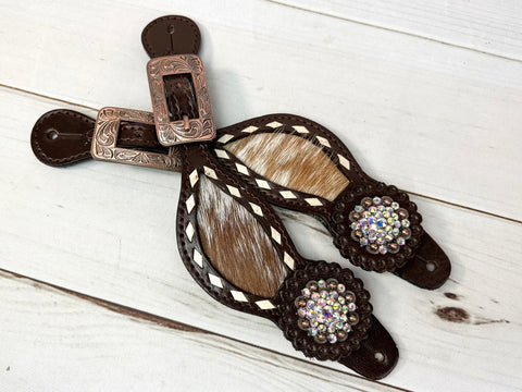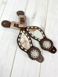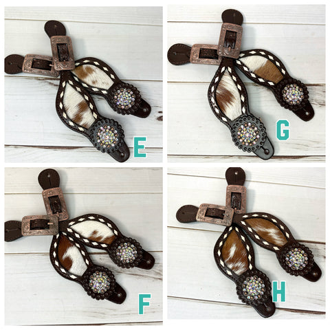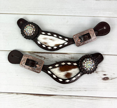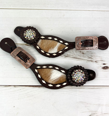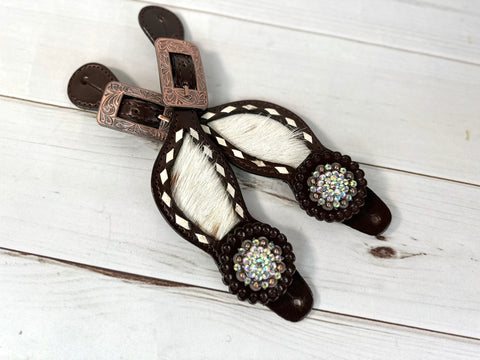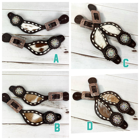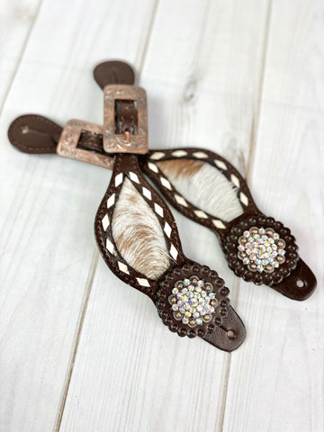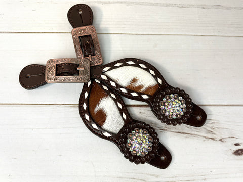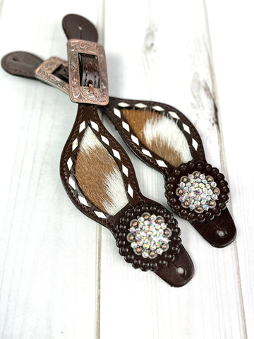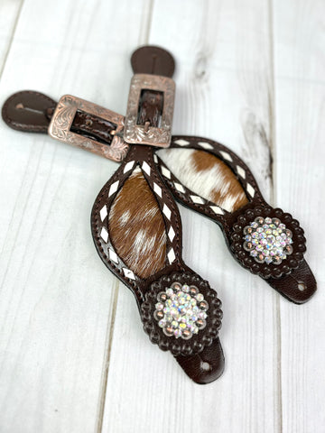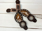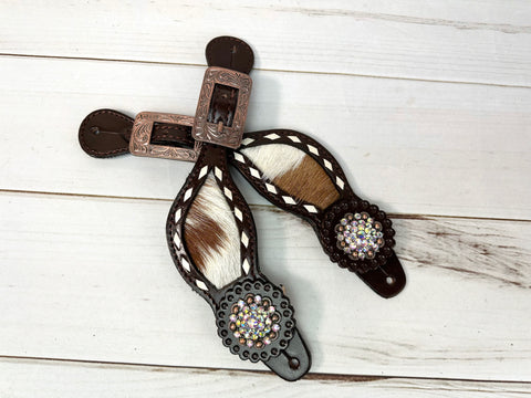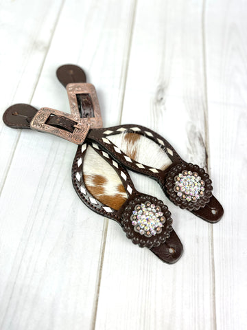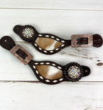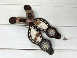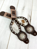 Rhinestone Concho Dark Leather and Cowhide Spur Straps