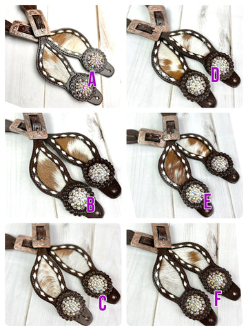 Adult Women’s size straps adjustable from approx. 9.5" from end to end at shortest length and 11.5" at longest. Leather with cowhide inset and buckstitch design. Copper buckles and crystal conchos.