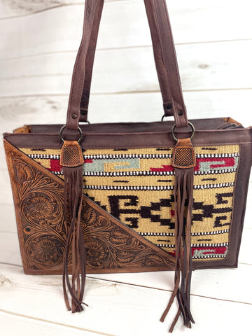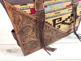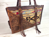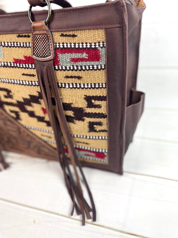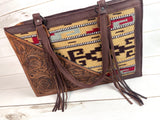 Tan, Wine and Grey Wool with Tooled Leather Swatch Large Western Tote