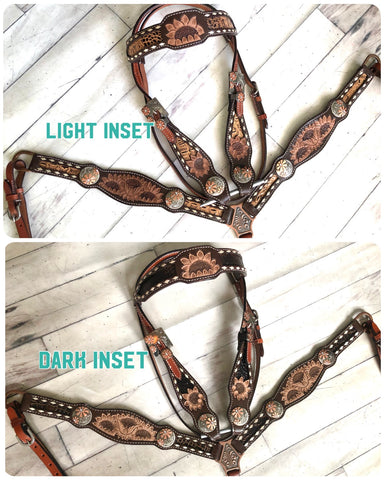 Tooled Sunflower White Buck Stitch with Tan Alligator Pattern Inset Tack Set (comes in 2 different color options)
