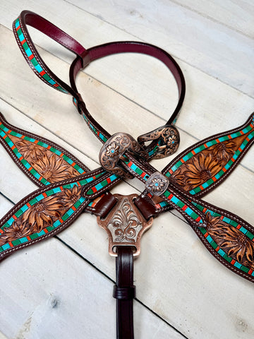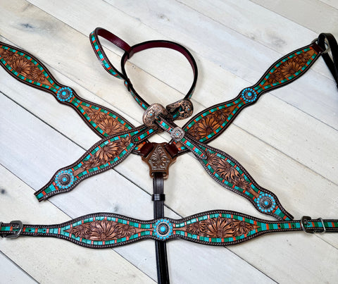 Turquoise Concho Green and Orange Sunflower Tack Set