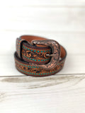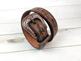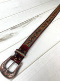 Leather Western style belt. Hand tooled and painted design with antique copper buckle (removable). See image on how to measure for your belt size.