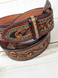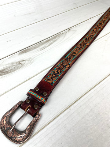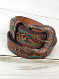 Turquoise Dotted Border Tooled Leather Woman’s Belt