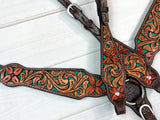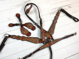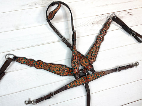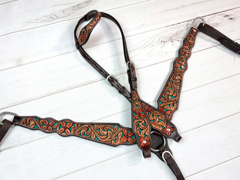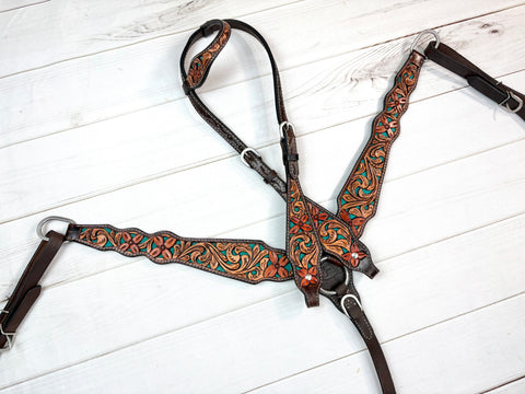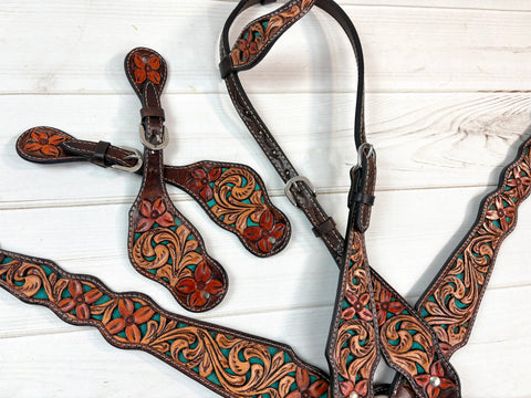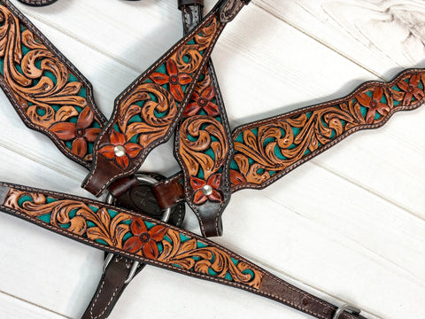 Leather tooled cut out over turquoise inset. Two tone leather floral pattern on a dark brown leather. One ear headstall and breast collar included in tack set. Select from drop-down menu for more options if available.