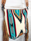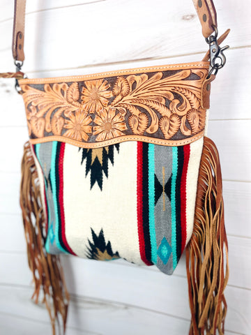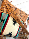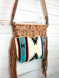 Wool Aztec designed with beautiful tooled leather and matching tooled crossbody strap (48”) leather fringe